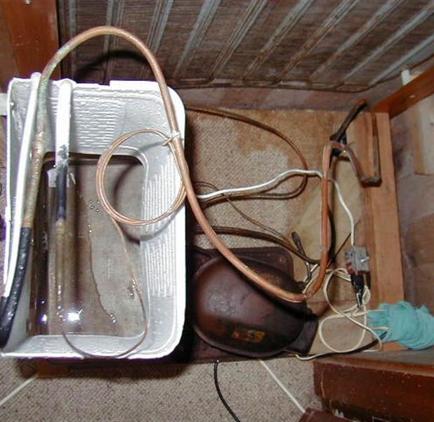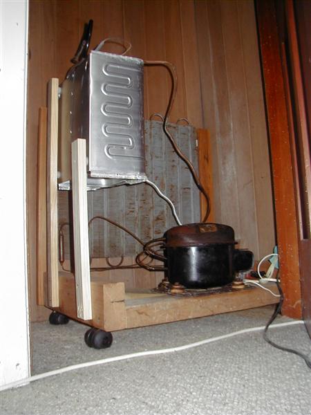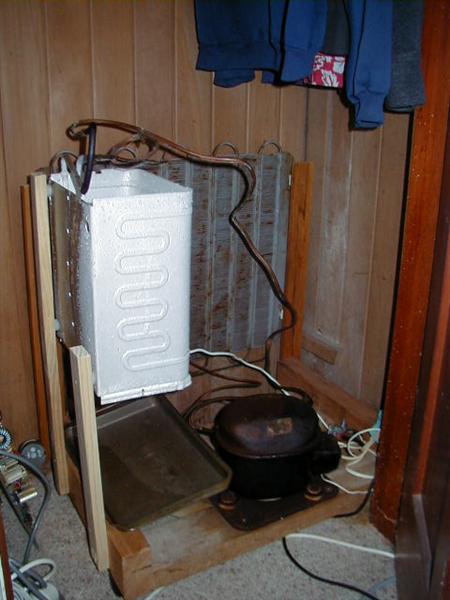 Here you can see how it fitted perfectly into a cupboard in a damp house I was living in, you can see the "frost" building up as the air hits the cold plate and drops it moisture. This freezes but after about 10 mins the thermostat triggers, and the compressor stops. Then as the ambient air warms the "frost", it thaws, and the water drips down and into my ex-girlfriends baking tray :)